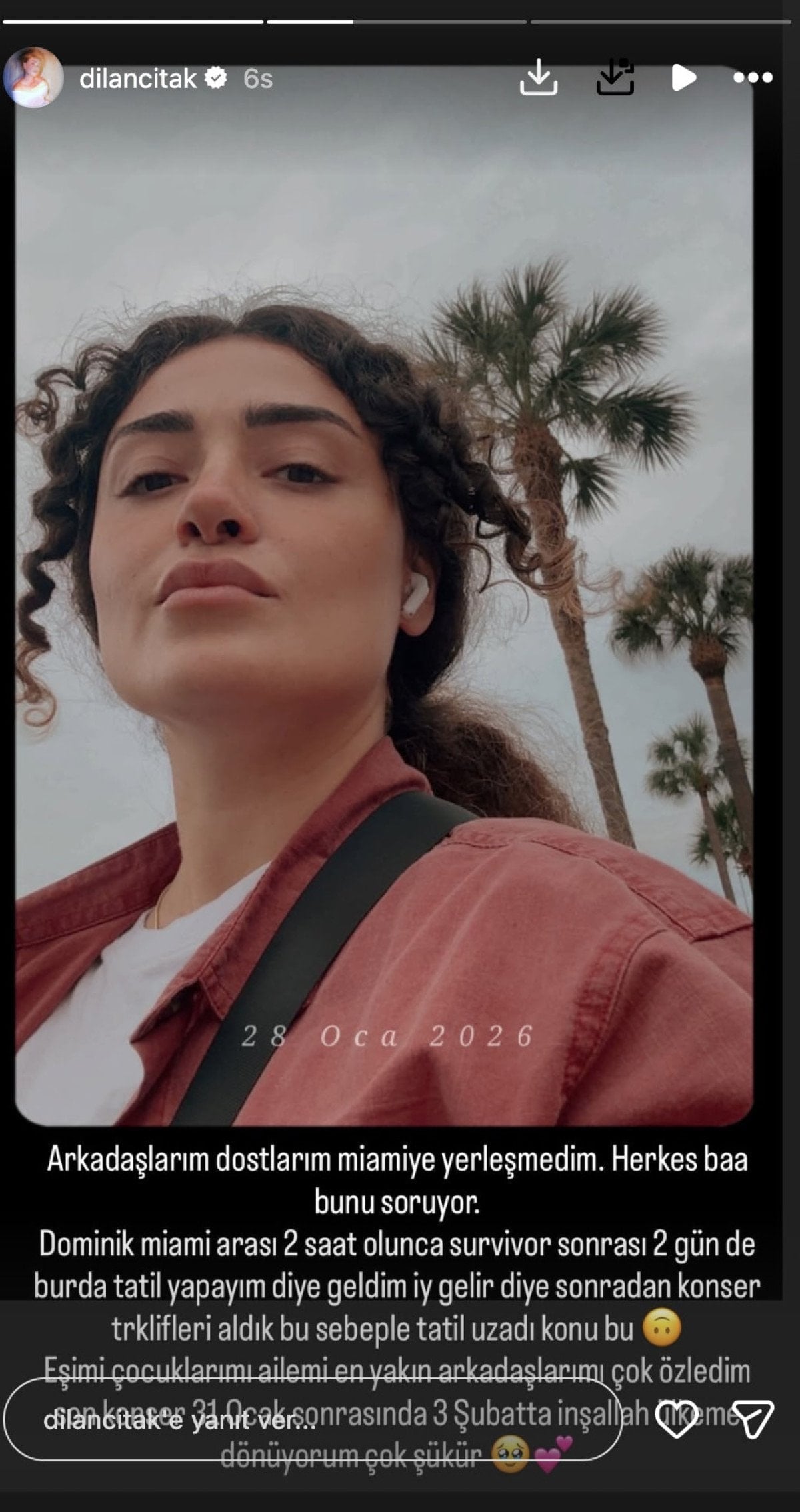 Konuyla ilgili Instagram paylaşım yapan Çıtak, mesajında; ”Arkadaşlarım, dostlarım Miami’ye yerleşmedim. Herkes bana bunu soruyor. Dominik Miami arası 2 saat olunca Survivor sonrası 2 gün de burada tatil yapayım diye geldim iyi gelir diye. Sonradan konser teklifleri aldık bu sebeple tatil uzadı konu bu. Eşimi, çocuklarımı, ailemi en yakın arkadaşlarımı çok özledim. Son konser 31 Ocak sonrasında 3 Şubat’ta inşallah ülkeme dönüyorum çok şükür” ifadelerini kullandı.