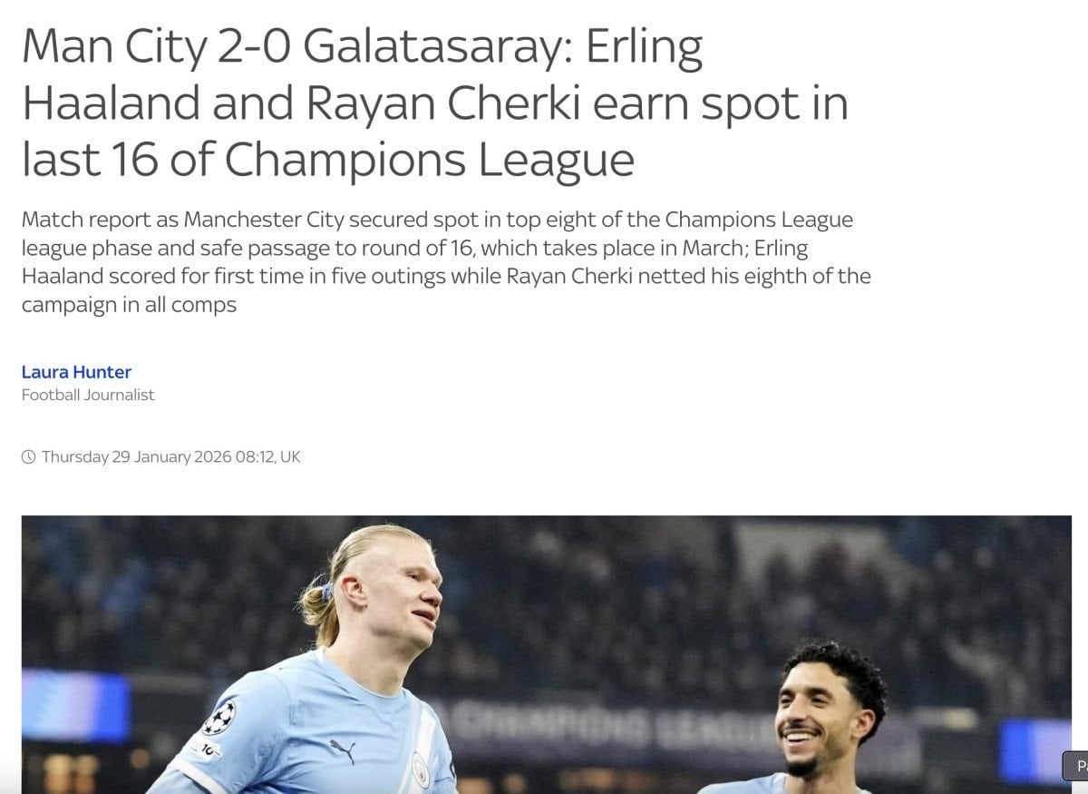 Manchester City, Çarşamba gecesi Şampiyonlar Ligi’nde Galatasaray’ı Erling Haaland ve Rayan Cherki’nin golleriyle 2-0 mağlup etti. Galatasaray’ın bazı anlarda etkili olmaya çalıştığı oldu ancak maça geri dönme şansını hiçbir zaman yakalayamadı. Bu galibiyetle City, lig aşamasındaki sekiz maçında 16 puana ulaştı.