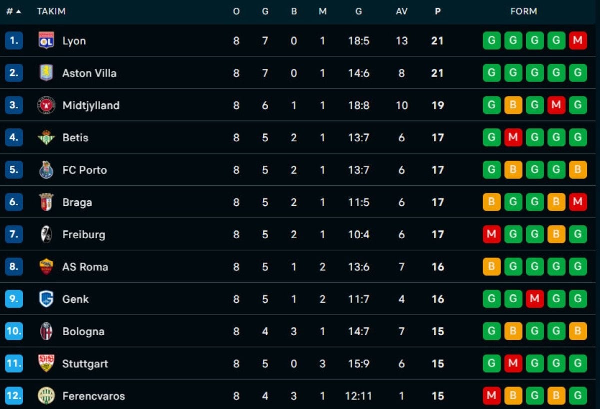 UEFA AVRUPA LİGİ’NDE PUAN DURUMU