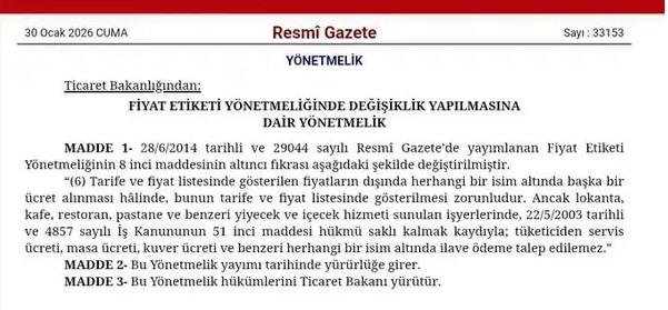 Yayımlanan yönetmelik şu şekilde: “Tarife ve fiyat listesinde gösterilen fiyatların dışında herhangi bir isim altında başka bir ücret alınması hâlinde, bunun tarife ve fiyat listesinde gösterilmesi zorunludur. Ancak lokanta, kafe, restoran, pastane ve benzeri yiyecek ve içecek hizmeti sunulan işyerlerinde, 22/5/2003 tarihli ve 4857 sayılı İş Kanununun 51 inci maddesi hükmü saklı kalmak kaydıyla; tüketiciden servis ücreti, masa ücreti, kuver ücreti ve benzeri herhangi bir isim altında ilave ödeme talep edilemez.”