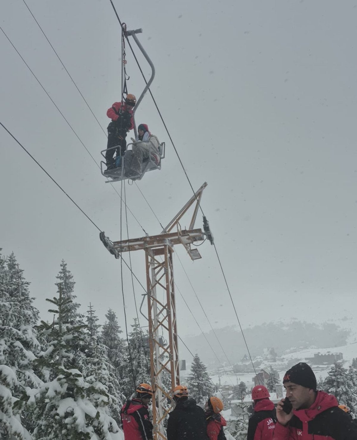 Başlatılan tahliye işlemlerinde halatlar yardımıyla havada kayaklarıyla asılı kalan tatilciler, aşağıya sağlıklı olarak indirildi.