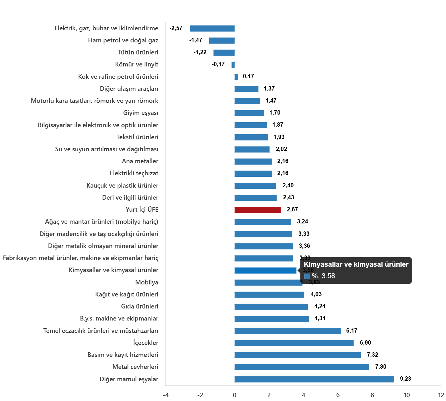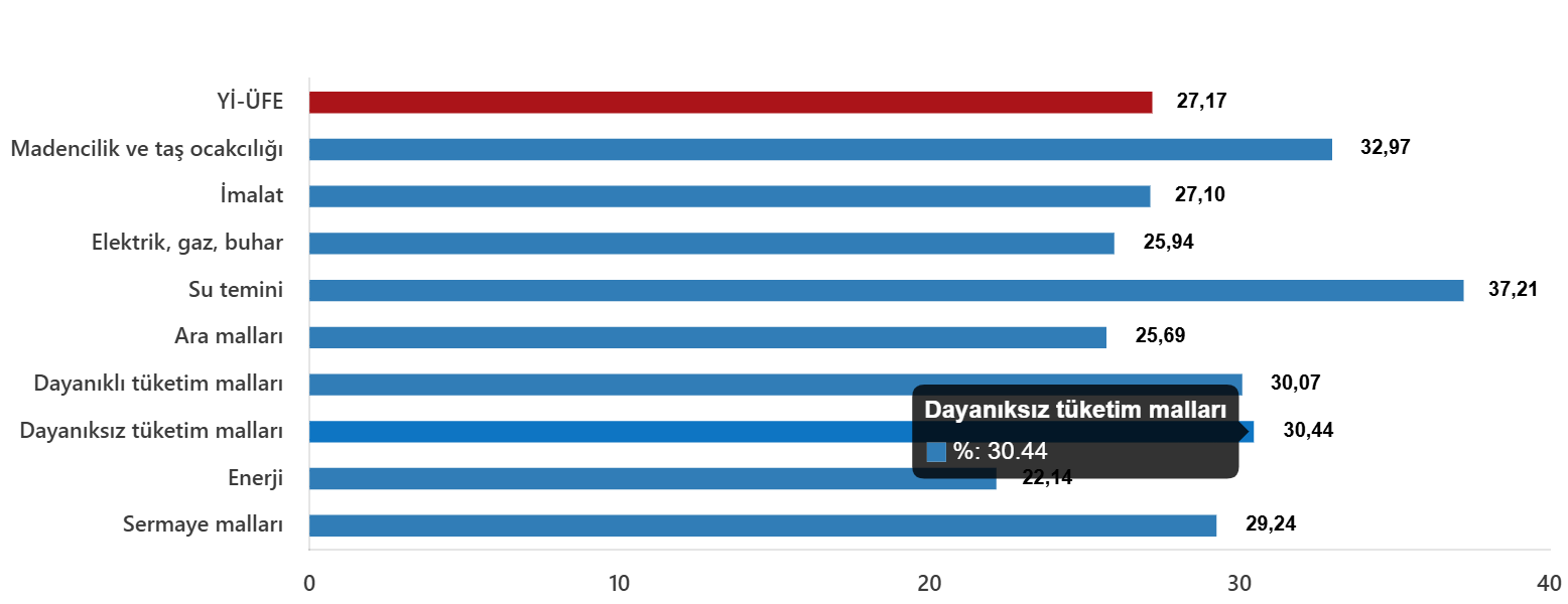 Ana sanayi gruplarının yıllık değişimleri; ara mallarında %25,69 artış, dayanıklı tüketim mallarında %30,07 artış, dayanıksız tüketim mallarında %30,44 artış, enerjide %22,14 artış ve sermaye mallarında %29,24 artış olarak gerçekleşti.