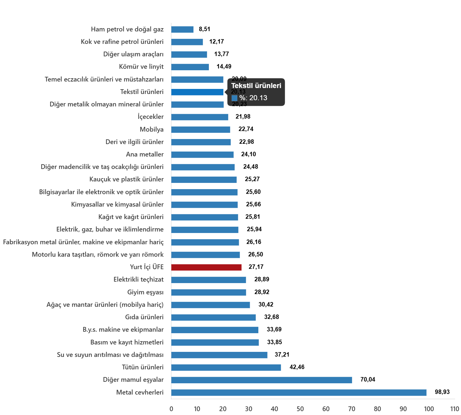 Yurt İçi Üretici Fiyat Endeksi (Yİ-ÜFE) yıllık %27,17 arttı, aylık %2,67 arttı