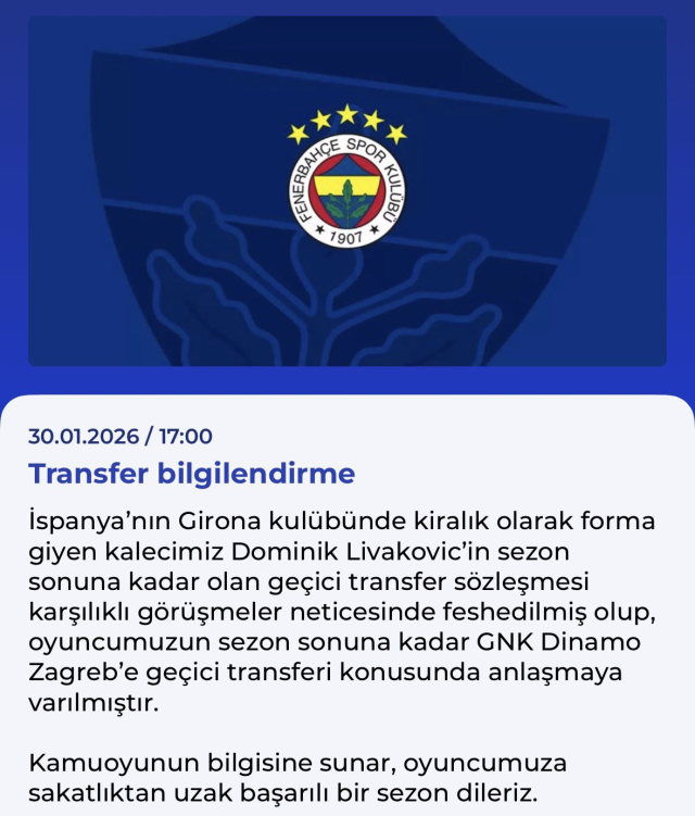 Kulüpten yapılan açıklamada, “İspanya’nın Girona kulübünde kiralık olarak forma giyen kalecimiz Dominik Livakovic’in sezon sonuna kadar olan geçici transfer sözleşmesi karşılıklı görüşmeler neticesinde feshedilmiş olup, oyuncumuzun sezon sonuna kadar GNK Dinamo Zagreb’e geçici transferi konusunda anlaşmaya varılmıştır” ifadeleri kullanıldı.