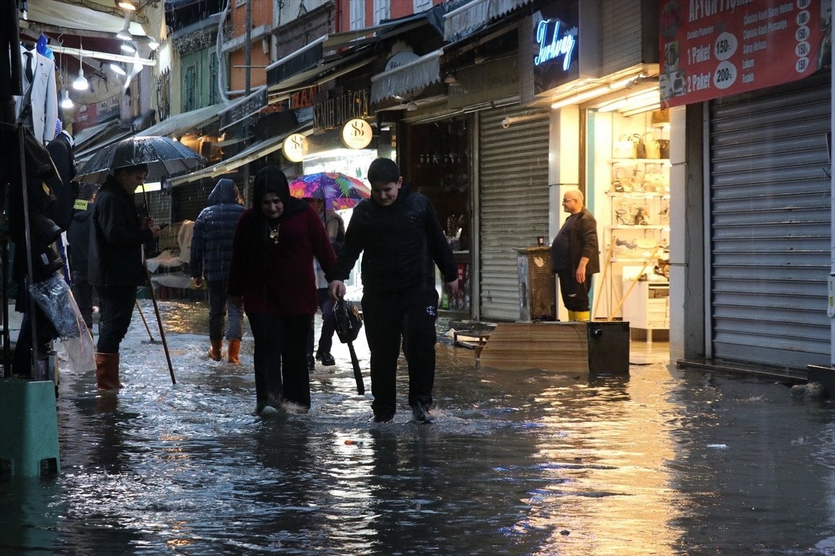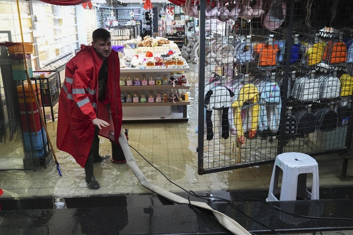 Esnaf, dükkanlarında biriken suyu fırça yardımıyla tahliye etmeye çalıştı.