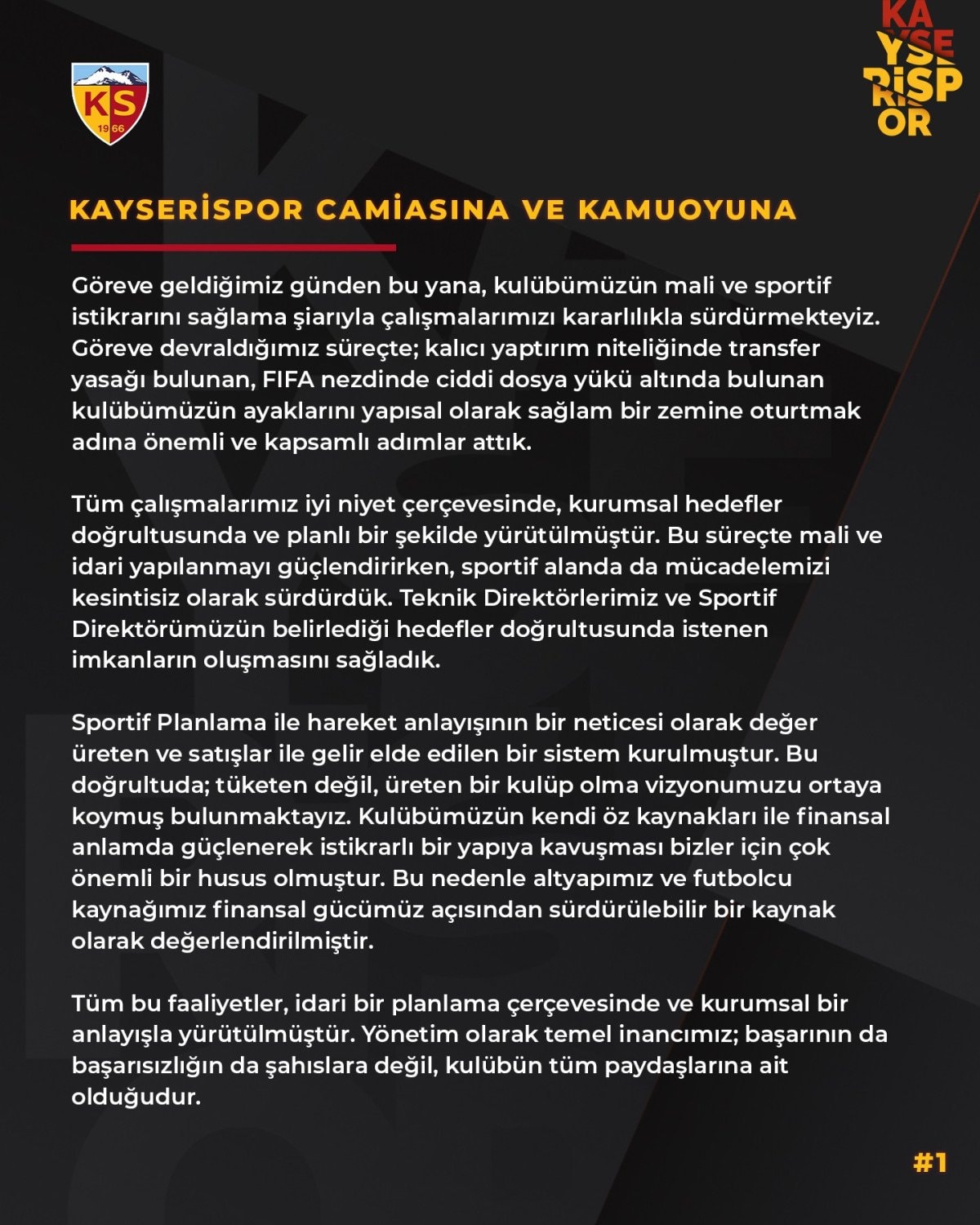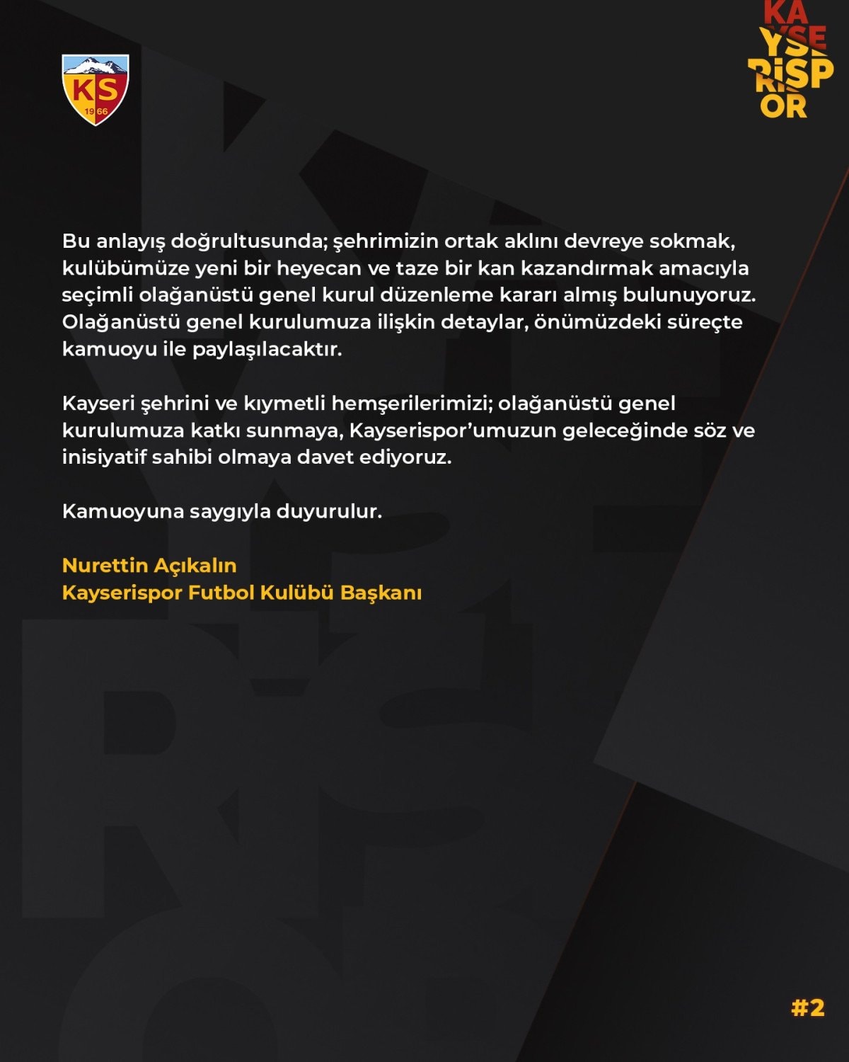 Tüm bu faaliyetler, idari bir planlama çerçevesinde ve kurumsal bir anlayışla yürütülmüştür. Yönetim olarak temel inancımız, başarının da başarısızlığın da şahıslara değil, kulübün tüm paydaşlarına ait olduğudur. Bu anlayış doğrultusunda, şehrimizin ortak aklını devreye sokmak, kulübümüze yeni bir heyecan ve taze bir kan kazandırmak amacıyla seçimli olağanüstü genel kurul düzenleme kararı almış bulunuyoruz. Olağanüstü genel kurulumuza ilişkin detaylar, önümüzdeki süreçte kamuoyu ile paylaşılacaktır. Kayseri şehrini ve kıymetli hemşerilerimizi, olağanüstü genel kurulumuza katkı sunmaya, Kayserispor’umuzun geleceğinde söz ve inisiyatif sahibi olmaya davet ediyoruz. Kamuoyuna saygıyla duyurulur.