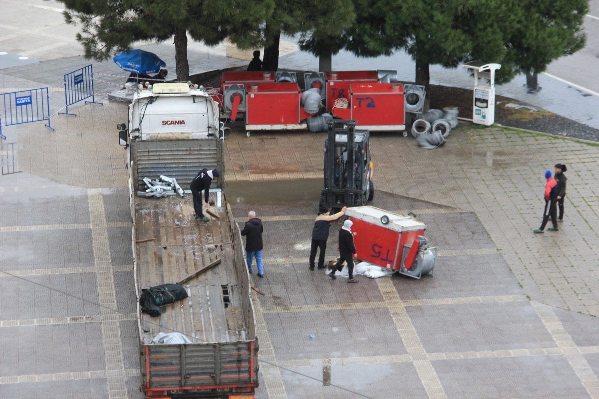 Samsun’un en yoğun noktalarından biri olan Cumhuriyet Meydanı’nda yapılan yük indirme çalışmaları sırasında meydana geldi. Ramazan çadırında kullanılmak üzere tırla alana getirilen havalandırma üniteleri için zabıta ekipleri tarafından geniş güvenlik önlemleri alındı ve meydan bariyerlerle çevrildi.