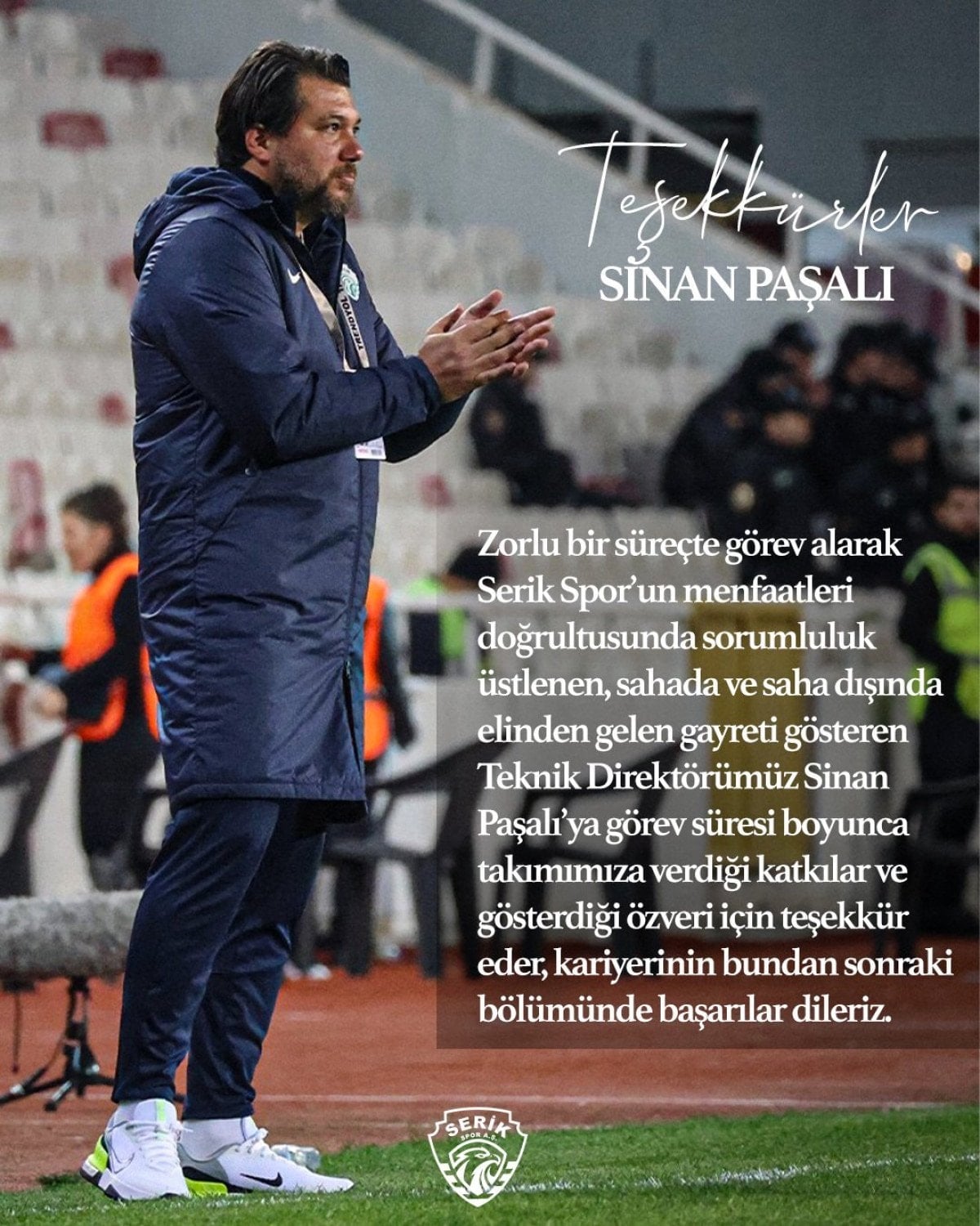 Kulüpten yapılan açıklamada, “Zorlu bir süreçte görev alarak Serikspor’un menfaatleri doğrultusunda sorumluluk üstlenen, sahada ve saha dışında elinden gelen gayreti gösteren teknik direktörümüz Sinan Paşalı’ya görev süresi boyunca takımımıza verdiği katkılar ve gösterdiği özveri için teşekkür eder, kariyerinin bundan sonraki bölümünde başarılar dileriz.” ifadelerine yer verildi.