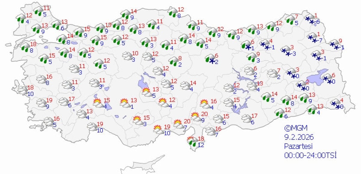 İç Anadolu ve Karadeniz’in bazı bölgelerinde parçalı bulutlu, doğu kesimlerde daha az yağışlı.