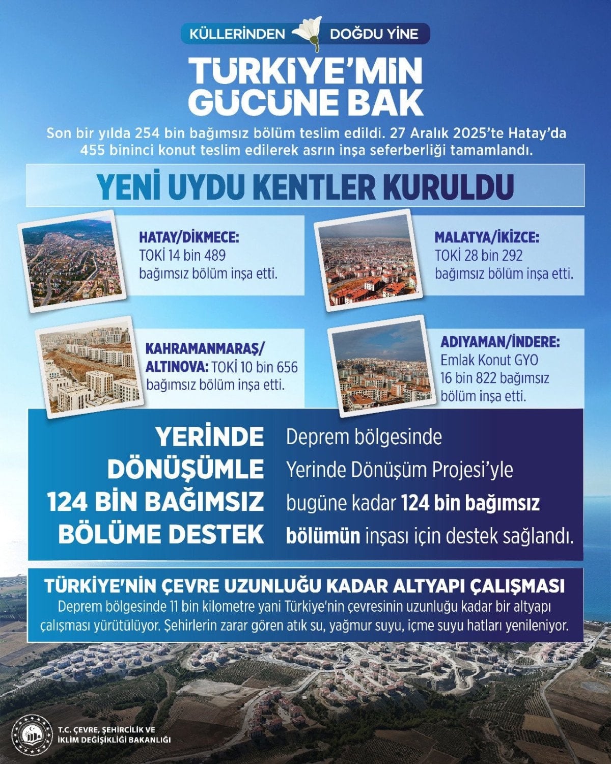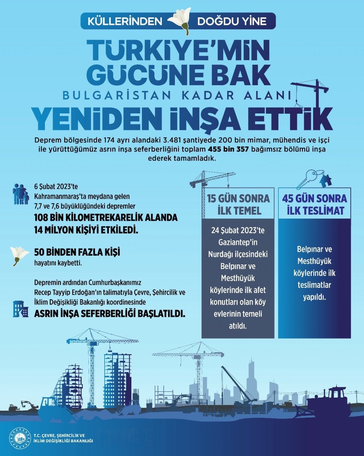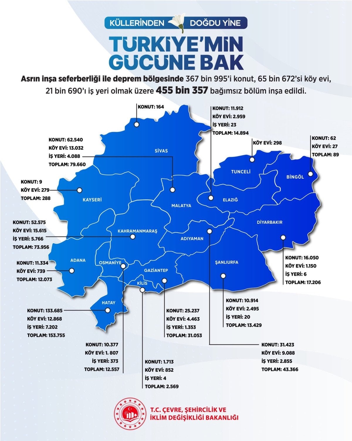 “Türkiye’min Gücüne Bak” sloganıyla paylaşılan görselde; “Asrın inşa seferberliği ile deprem bölgesinde 367 bin 995’i konut, 65 bin 672’si köy evi, 21 bin 690’ı iş yeri olmak üzere 455 bin 357 bağımsız bölüm inşa edildi.” notuna yer verildi.
