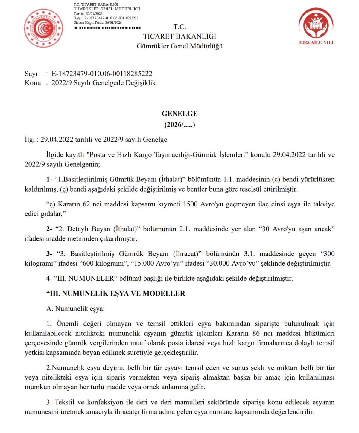 Ticaret Bakanlığı tarafından yayımlanan Genelge, bugün (6 Şubat 2026) tarihinde yürürlüğe girecek.