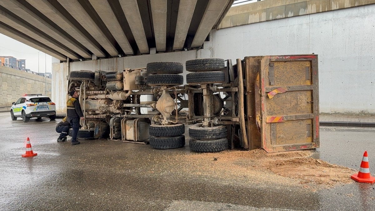 Gaziantep’in Şehitkamil ilçesi Mustafa Taşar Caddesi’nde, plakası ve sürücüsü henüz öğrenilemeyen kamyonun damperi, bilinmeyen bir nedenle seyir halindeyken açıldı. Açık damperin köprüye çarpmasıyla birlikte sürücünün direksiyon hakimiyetini kaybettiği kamyon yan yatarak durabildi.