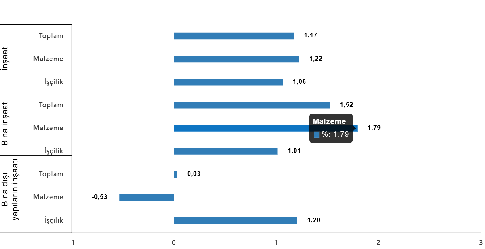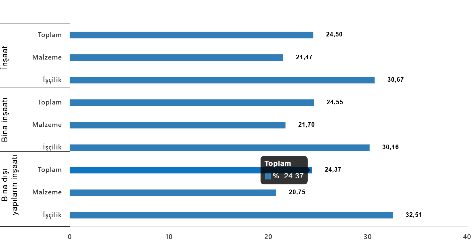 Bina dışı yapılar için inşaat maliyet endeksi, bir önceki aya göre %0,03 arttı, bir önceki yılın aynı ayına göre %24,37 arttı. Bir önceki aya göre malzeme endeksi %0,53 azaldı, işçilik endeksi %1,20 arttı. Ayrıca bir önceki yılın aynı ayına göre malzeme endeksi %20,75 arttı, işçilik endeksi %32,51 arttı.