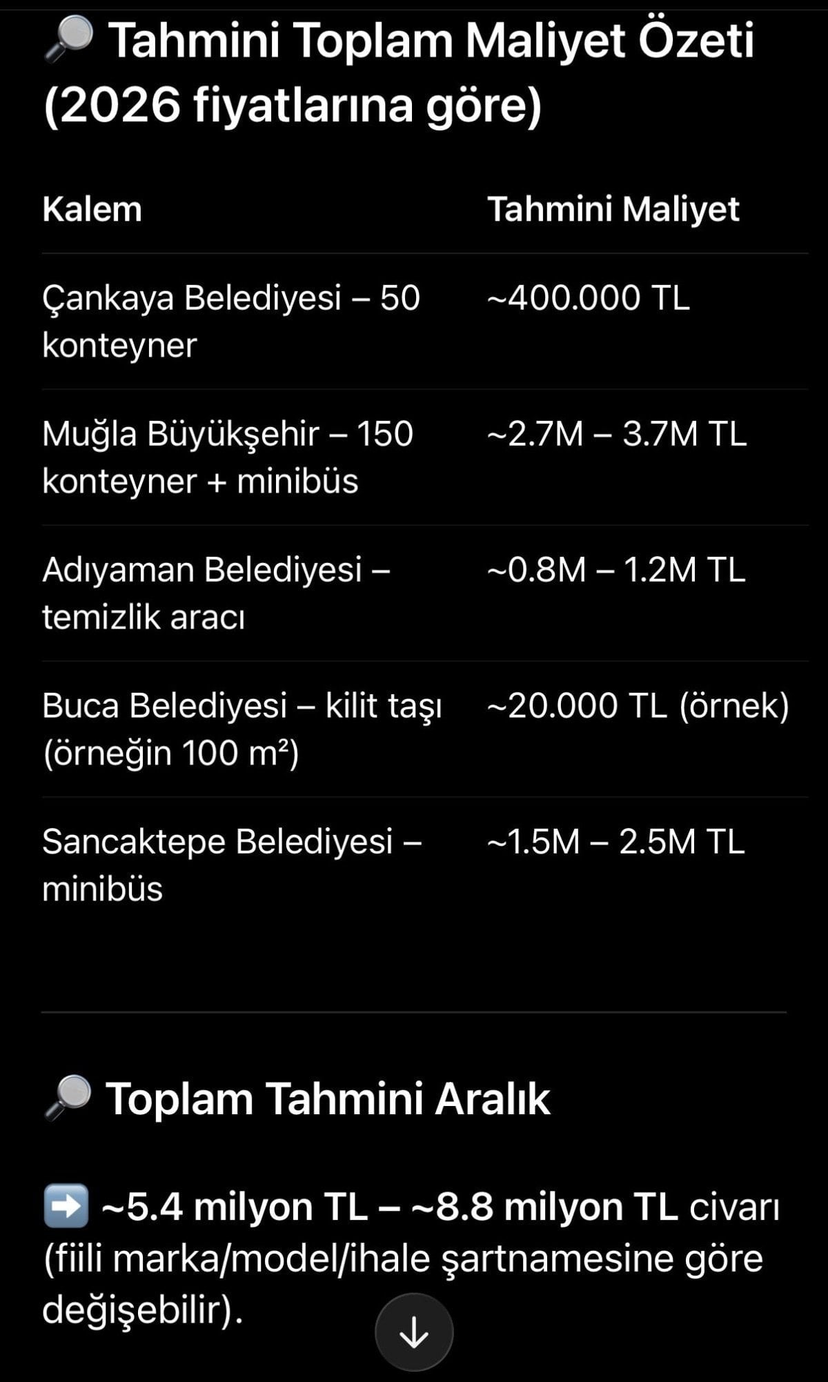 Buna göre çöp konteynerleri, minibüsler, temizlik aracı ve kilit taşı gibi desteklerin 2026 fiyatlarıyla toplam tahmini bedelinin 5,4 milyon TL ile 8,8 milyon TL arasında kaldığı ortaya çıktı.