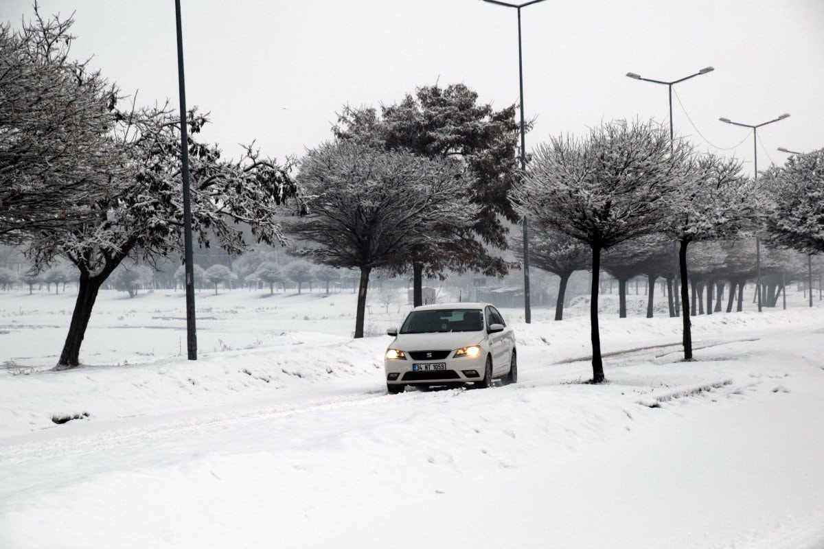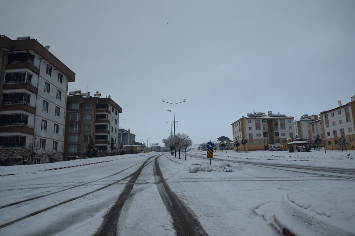 İlçe merkezi beyaza bürünürken yetkililer, sürücüleri dikkatli olmaları konusunda uyardı.