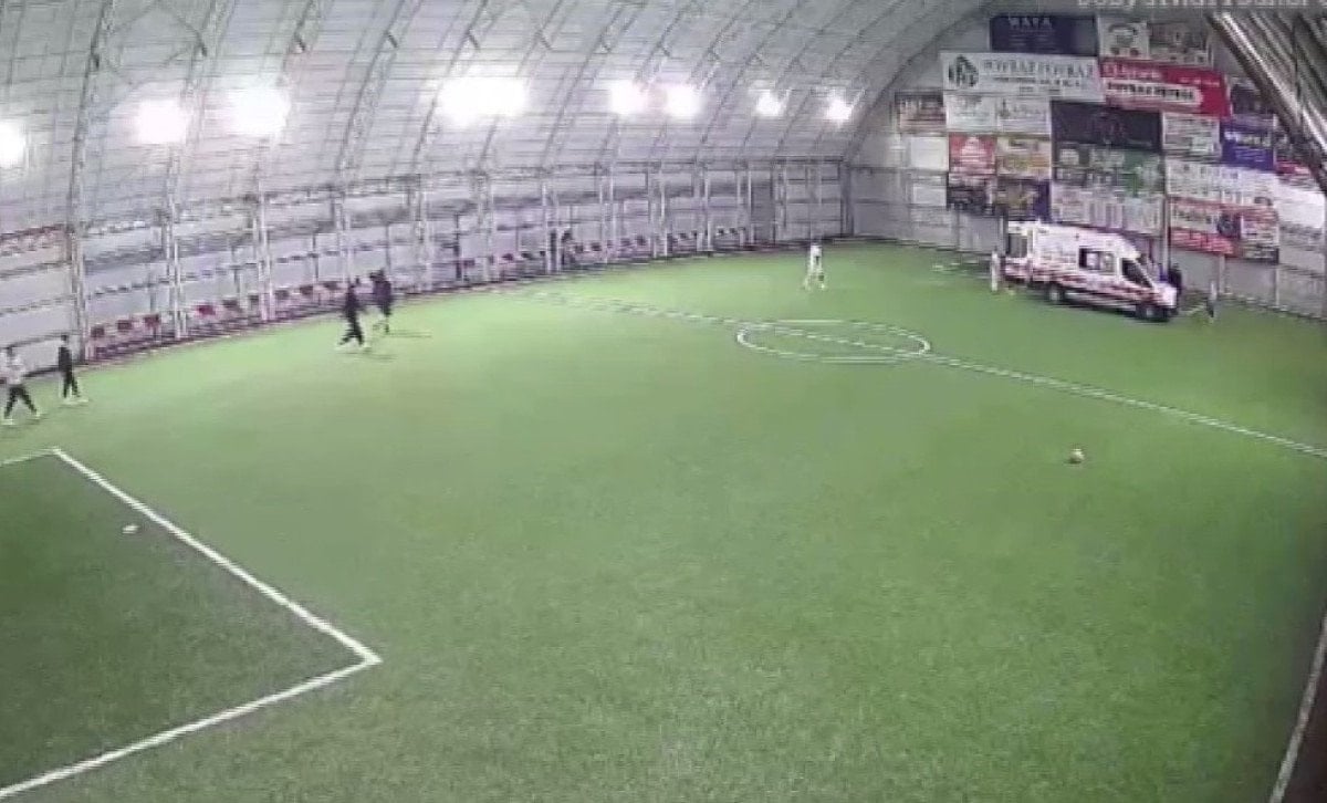 Öğretmenin, halı sahada rahatsızlandığı ve yere yığıldığı anlar, güvenlik kamerası tarafından kaydedildi.