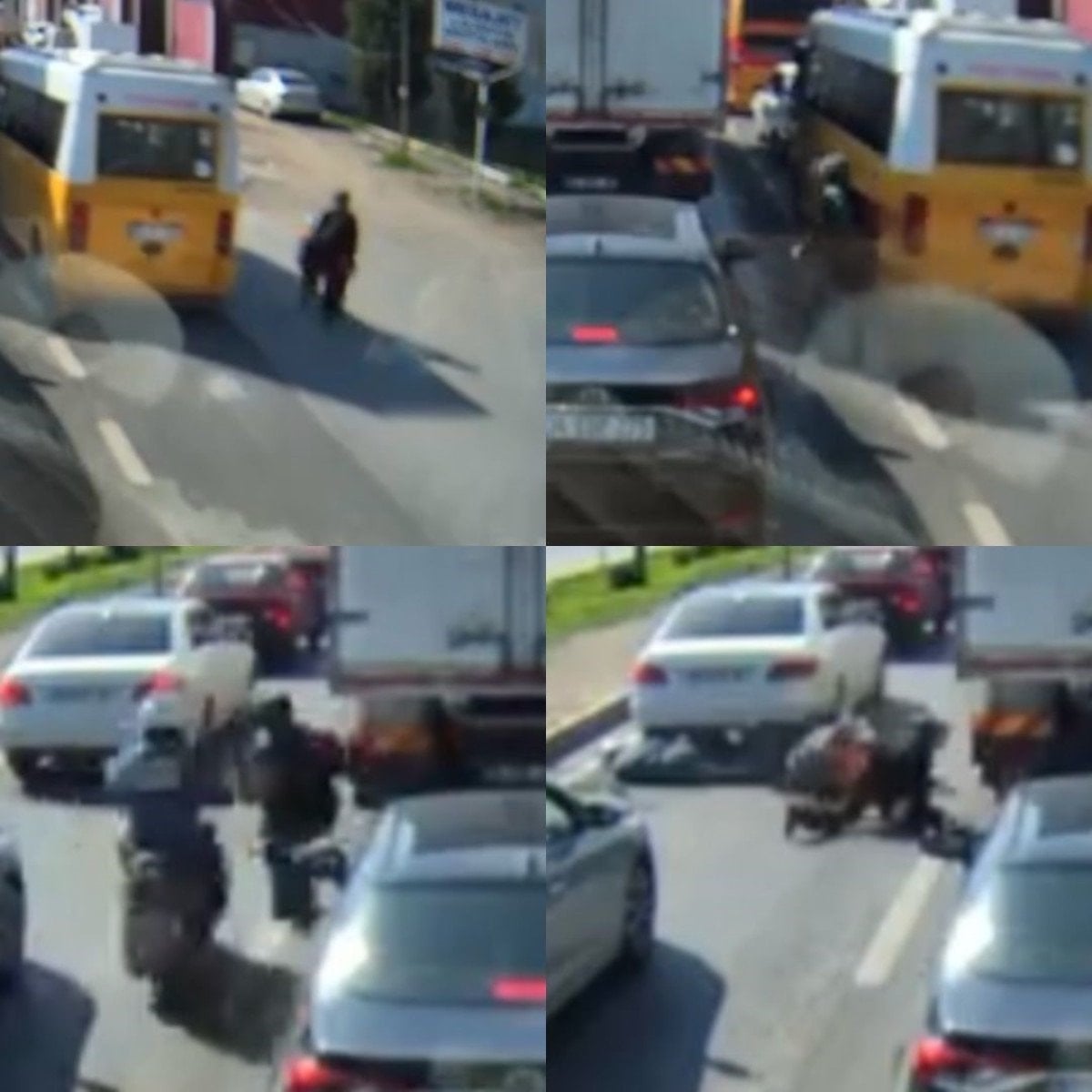 Korku dolu anlar ise bir aracın kamerasına saniye saniye yansıdı. Görüntülerde, trafiğin durduğu sırada çocuğuyla birlikte karşıya geçmeye çalışan kadına, araçların arasından gelen motosikletin çarptığı anlar yer aldı.