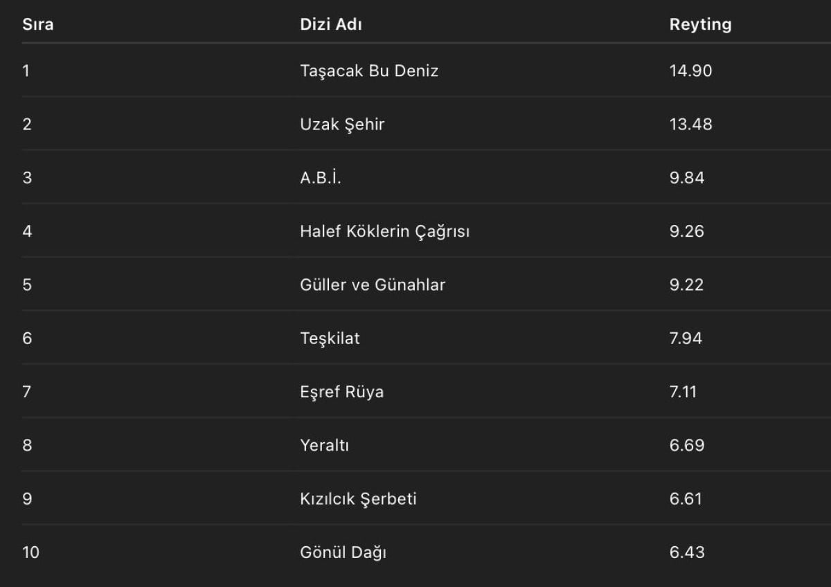 Uzak Şehir dizisi ikinci sırada, A.B.İ. dizisi ise üçüncü sırada yer aldı.