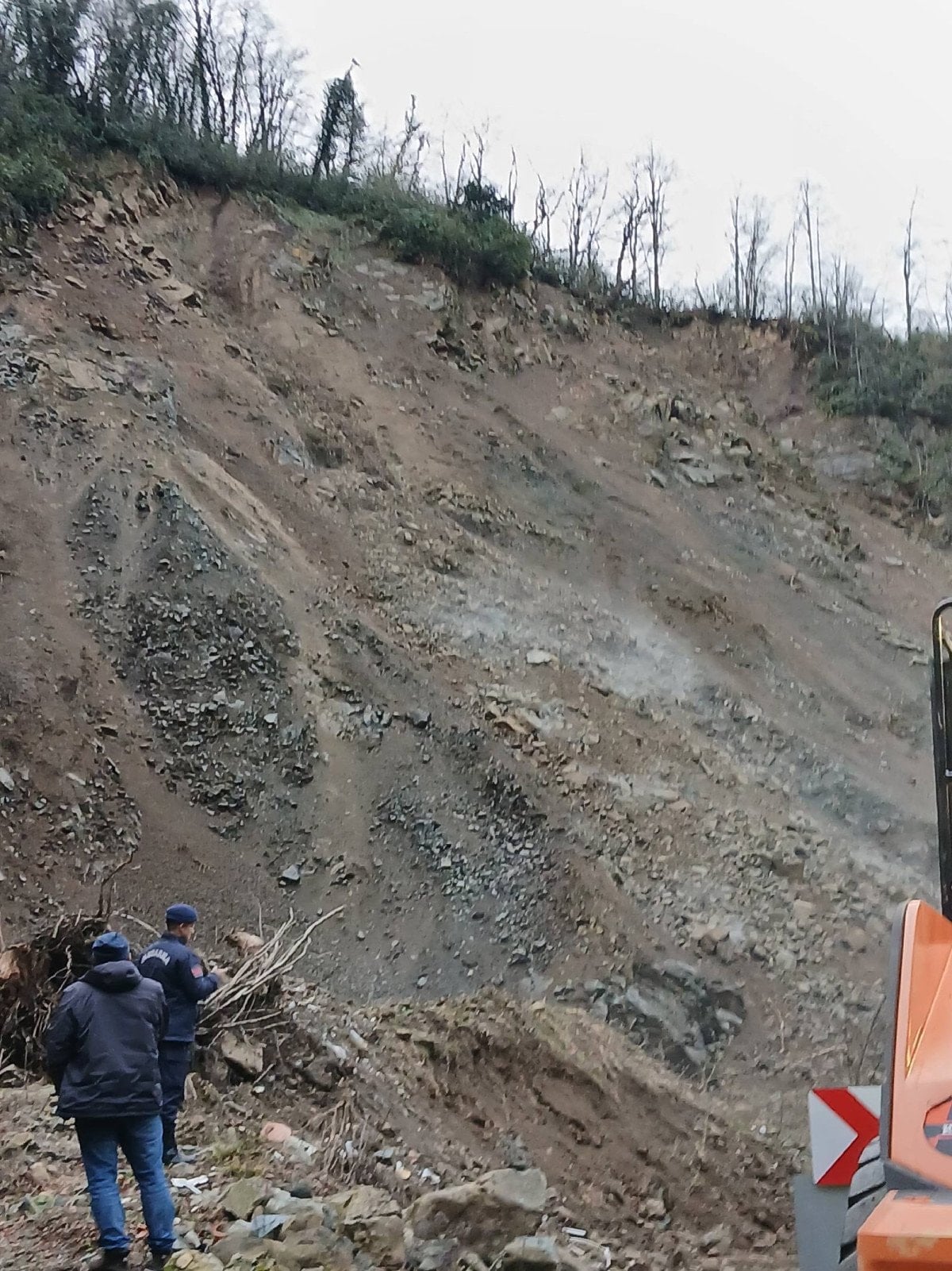 Heyelanda yamaçtan kopan kaya parçaları ve toprak nedeniyle köy yolu ulaşıma tamamen kapandı.