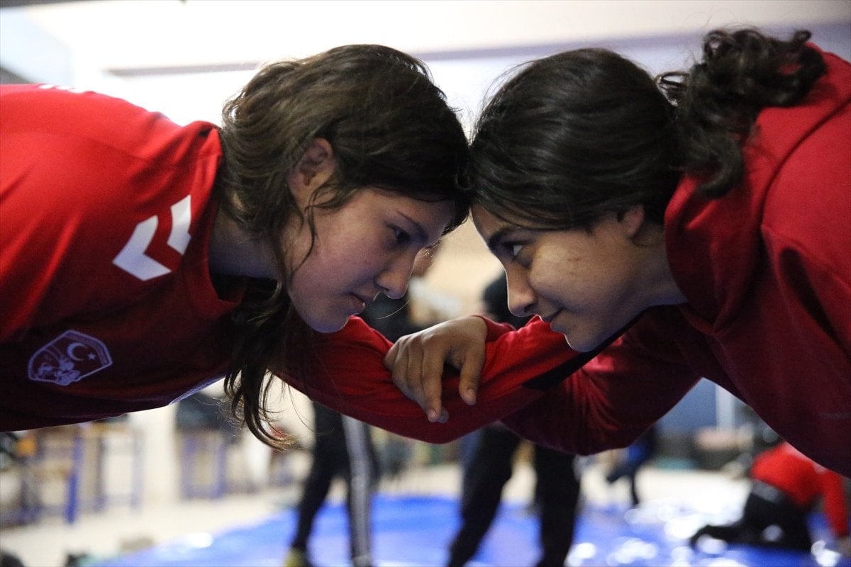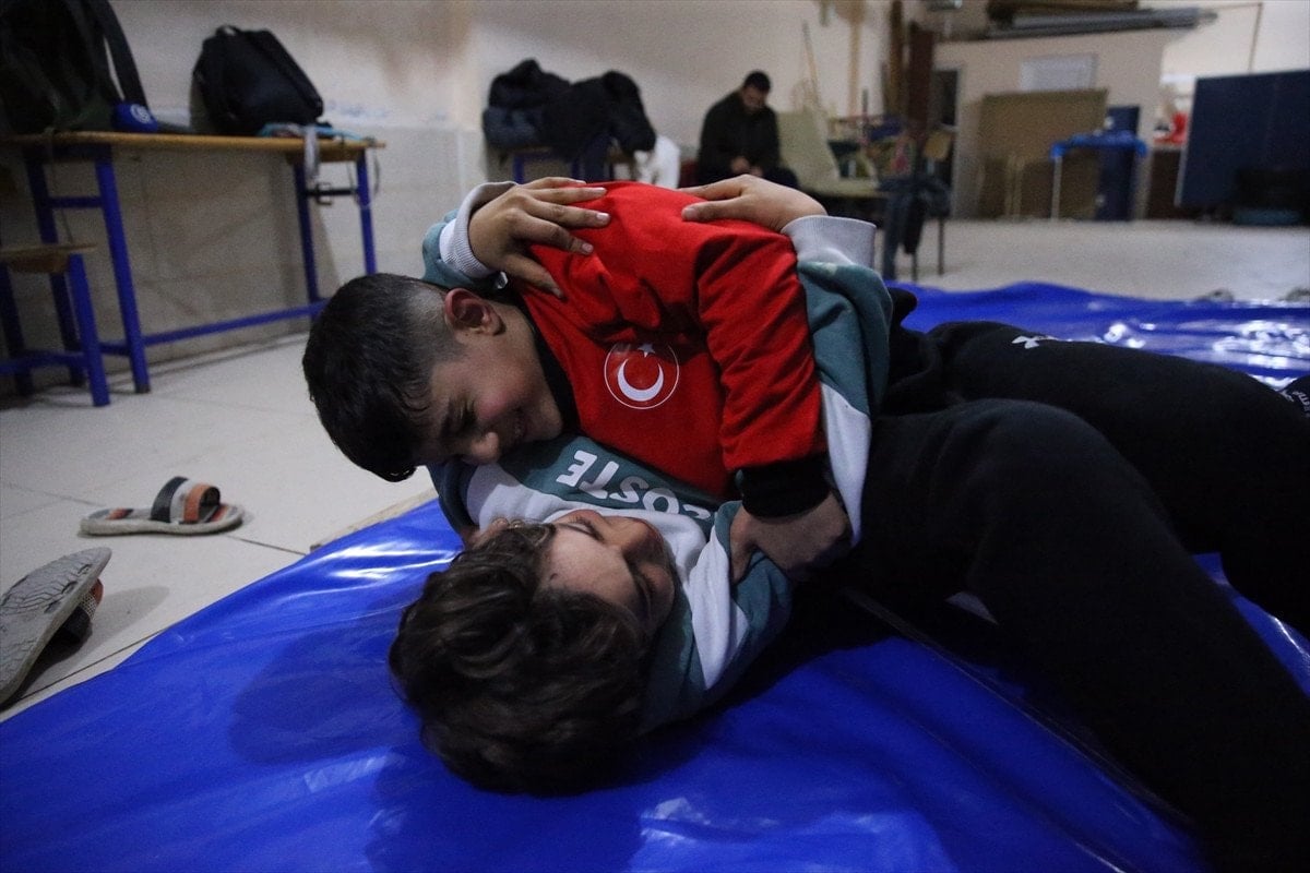 Hatay’ın Payas ilçesinde bulunan Şehit Yener Çevik İlkokulu’nun bodrum katında oluşturulan salonda güreş eğitimi alan öğrenciler, antrenmanlarını büyük bir azimle sürdürüyor.