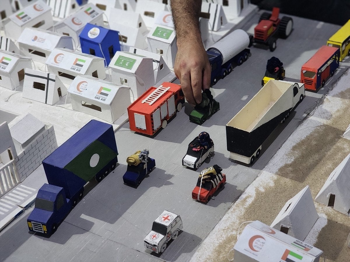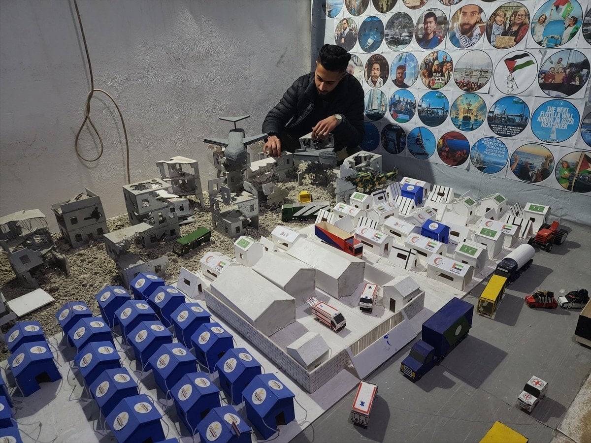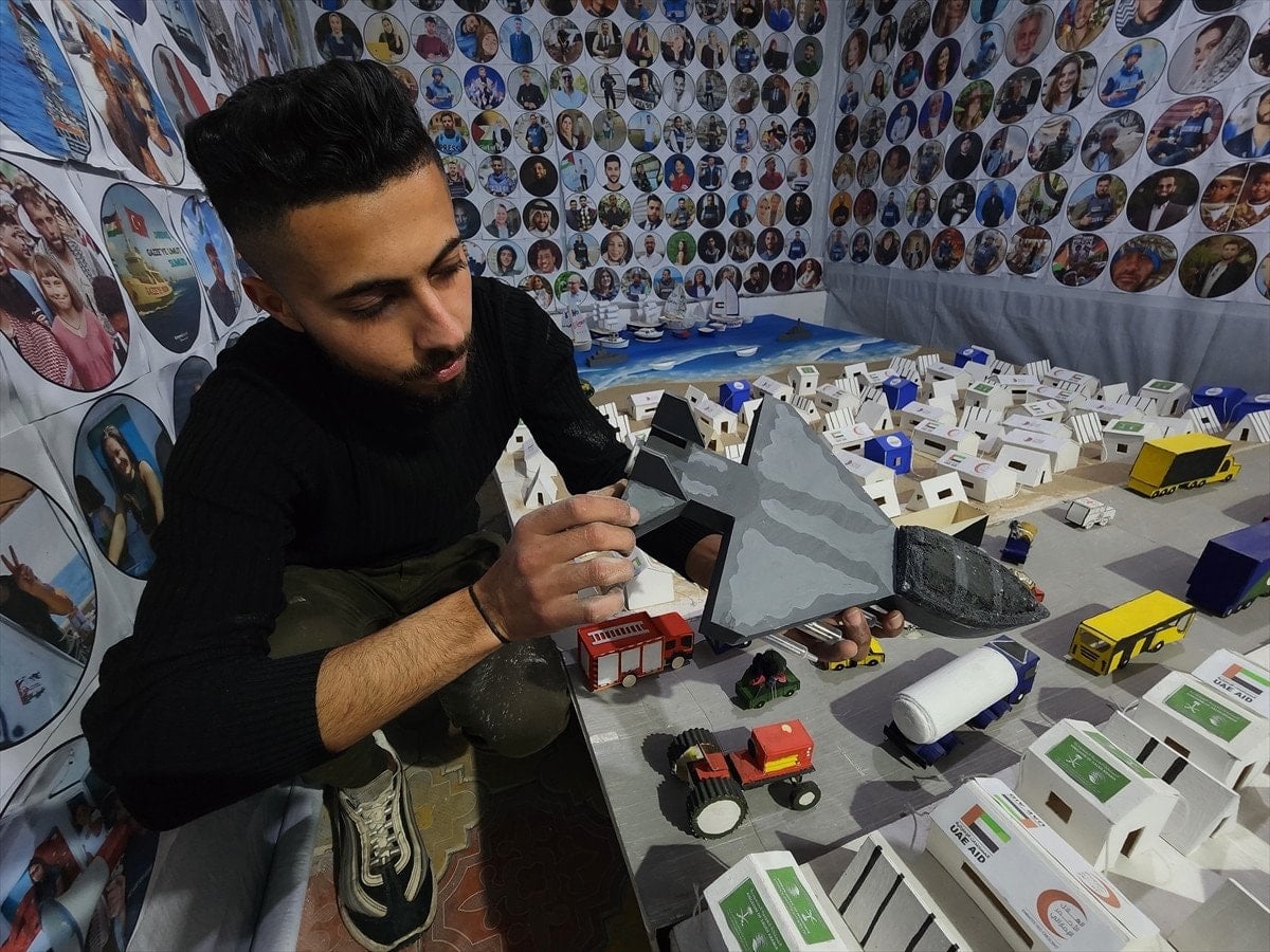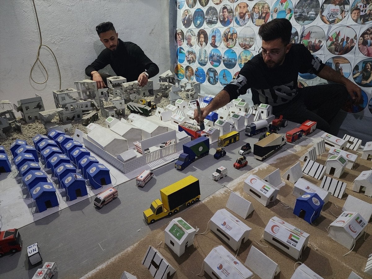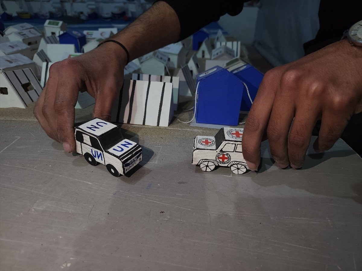 Gazze’nin güneyindeki Han Yunus kentinde yaşayan Muhammed en-Neccar, Yezin Şahin ve Vaad el-Hams, İsrail saldırılarının izlerini taşıyan maketler hazırlıyor. Çalışmalarda, bombardımandan kaçan sivilleri taşıyan araçlar, ambulanslar, sahra hastaneleri, sivil savunma ekipleri ve havadan yardım atan askeri kargo uçakları gibi detaylar yer alıyor.