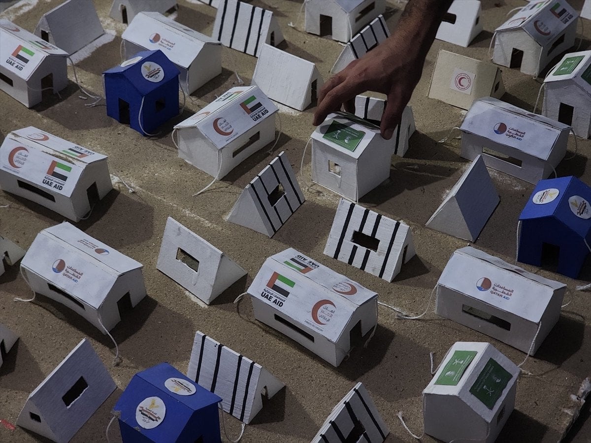Filistinli kaynaklara göre, Gazze’deki yapıların büyük bölümünün zarar gördüğü saldırılar sonucu 1,5 milyondan fazla Filistinli derme çatma çadırlara sığınmak zorunda kaldı. Gençler, bu süreci maketlere yansıtarak hem yıkılan evleri hem de deniz kıyılarına kurulan çadır kamplarındaki yaşamı betimliyor.