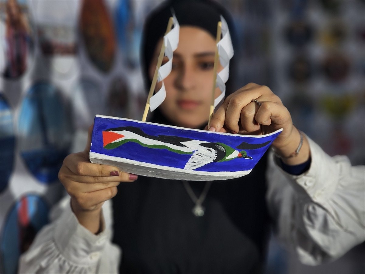 Gençler, İsrail ablukasını kırmak amacıyla Gazze’ye doğru yola çıkan yardım teknelerini ve denize açılmaları engellenen balıkçıları da çalışmalarında sembolize etti. Açlık günlerinde gökyüzünden atılacak yardım kolilerini bekleyen insanların umutları, askeri kargo uçağı maketleriyle anlatıldı.