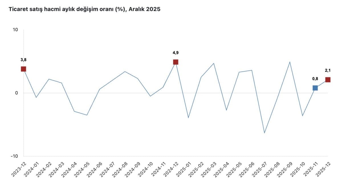 Buna göre, ticaret satış hacmi, Aralık 2025’te bir önceki aya kıyasla yüzde 2,1 artış gösterdi.