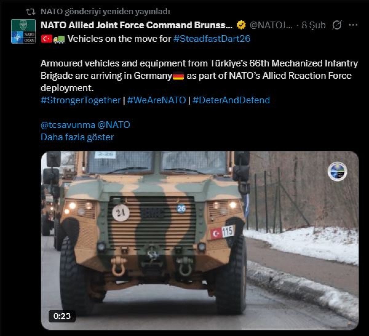 Bununla birlikte NATO Müttefik Orta Kuvvet Komutanlığı, X platformundan Türkiye’ye ait zırhlı araç ve teçhizatları paylaşarak, “Türkiye’nin 66. Mekanize Piyade Tugayı’na ait zırhlı araçlar ve teçhizat, NATO’nun Müttefik Tepki Gücü konuşlandırmasının bir parçası olarak Almanya’ya geliyor” ifadelerini kullandı.