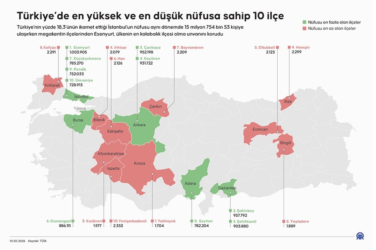Listenin ilk sırasında yer alan Esenyurt’u, Gaziantep’in Şahinbey (957 bin 792) ve Ankara’nın Çankaya (952 bin 198) ilçeleri takip etti.
