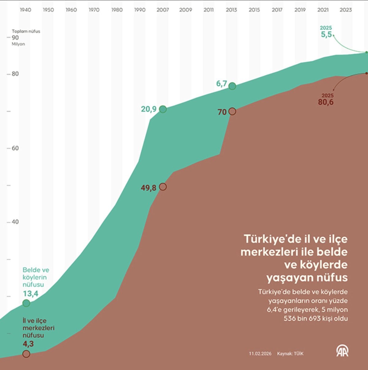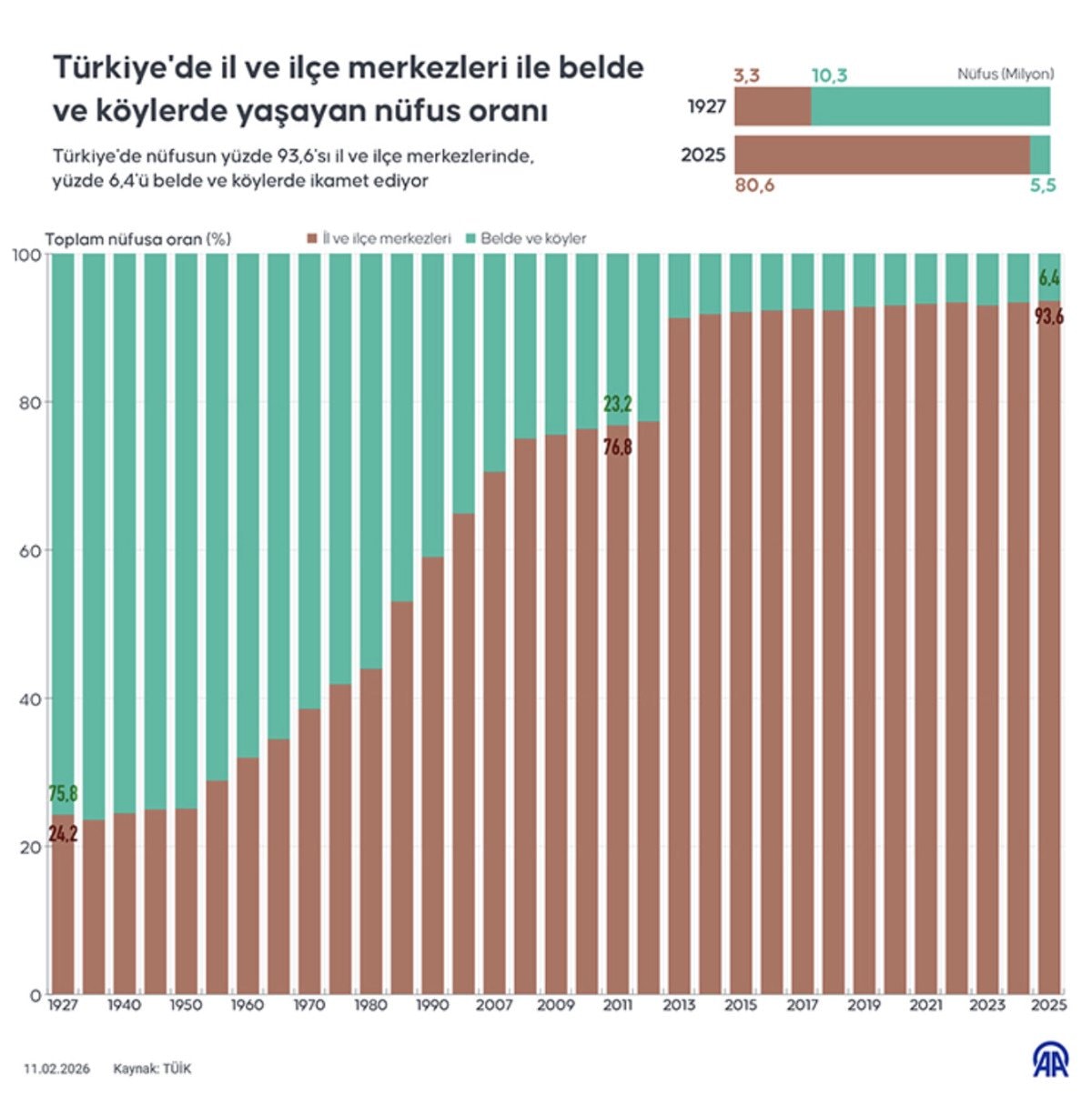 Toplam nüfus içinde il ve ilçe merkezlerinde ikamet edenlerin oranı 2024’te yüzde 93,4 iken 2025’te yüzde 93,6’ya yükseldi.