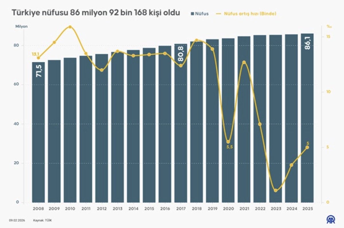 Türkiye İstatistik Kurumu (TÜİK) ülke nüfusu 2025’te bir önceki yıla kıyasla 427 bin 224 kişi artarak 86 milyon 92 bin 168 kişi olduğunu açıkladı.