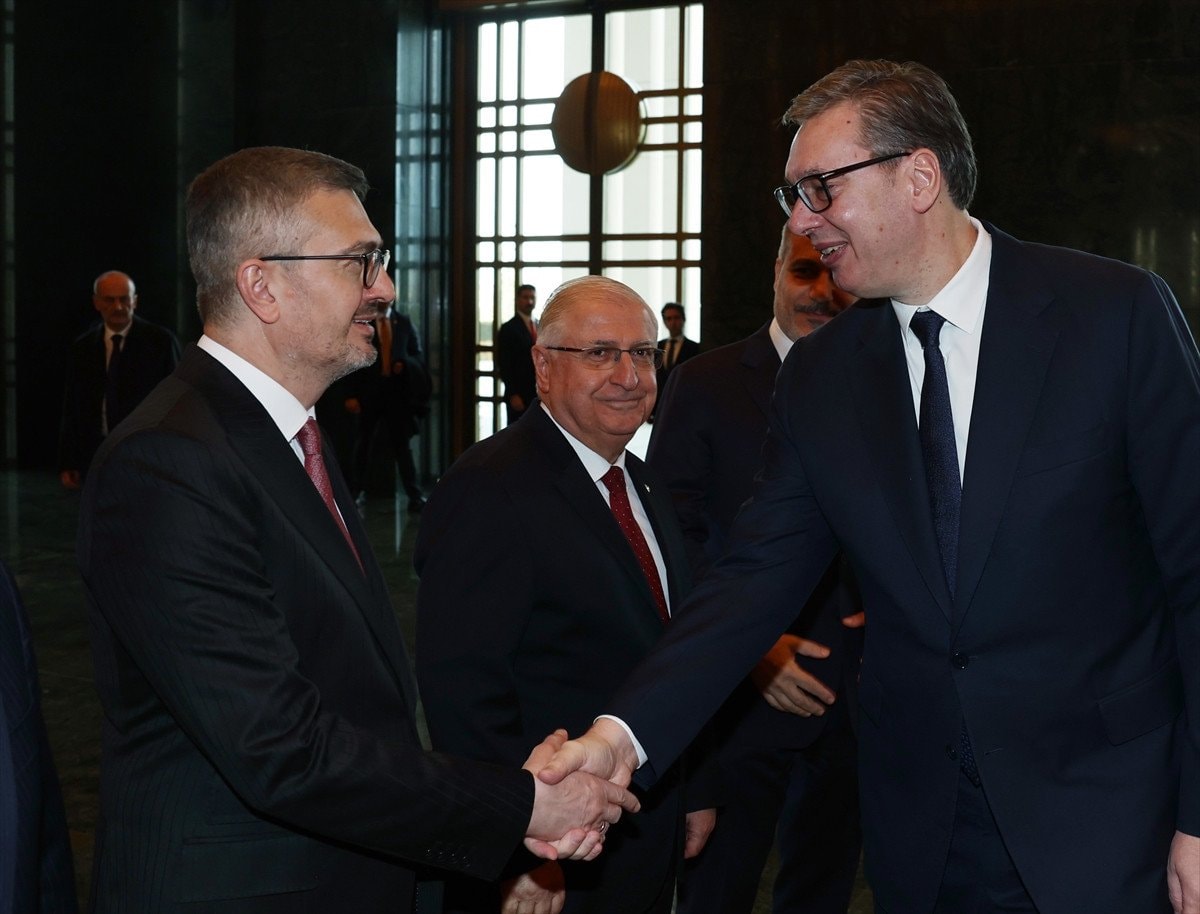 Sırbistan Cumhurbaşkanı Aleksandar Vucic, Ankara’daki temasları kapsamında Cumhurbaşkanlığı Külliyesi’nde düzenlenen resmi törenle karşılandı. Törenin ardından Erdoğan ve Vucic baş başa görüşmeye geçti.