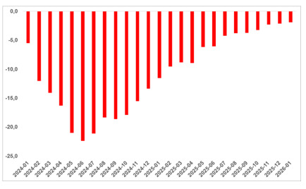 Ülke genelinde uzun bir süredir negatif bölgede seyreden reel kirada yıllık değişim oranı ocak ayında da negatif bölgedeki seyrine devam etti ve yıllık reel kira değişim oranı yüzde -2,1 olarak gerçekleşti.