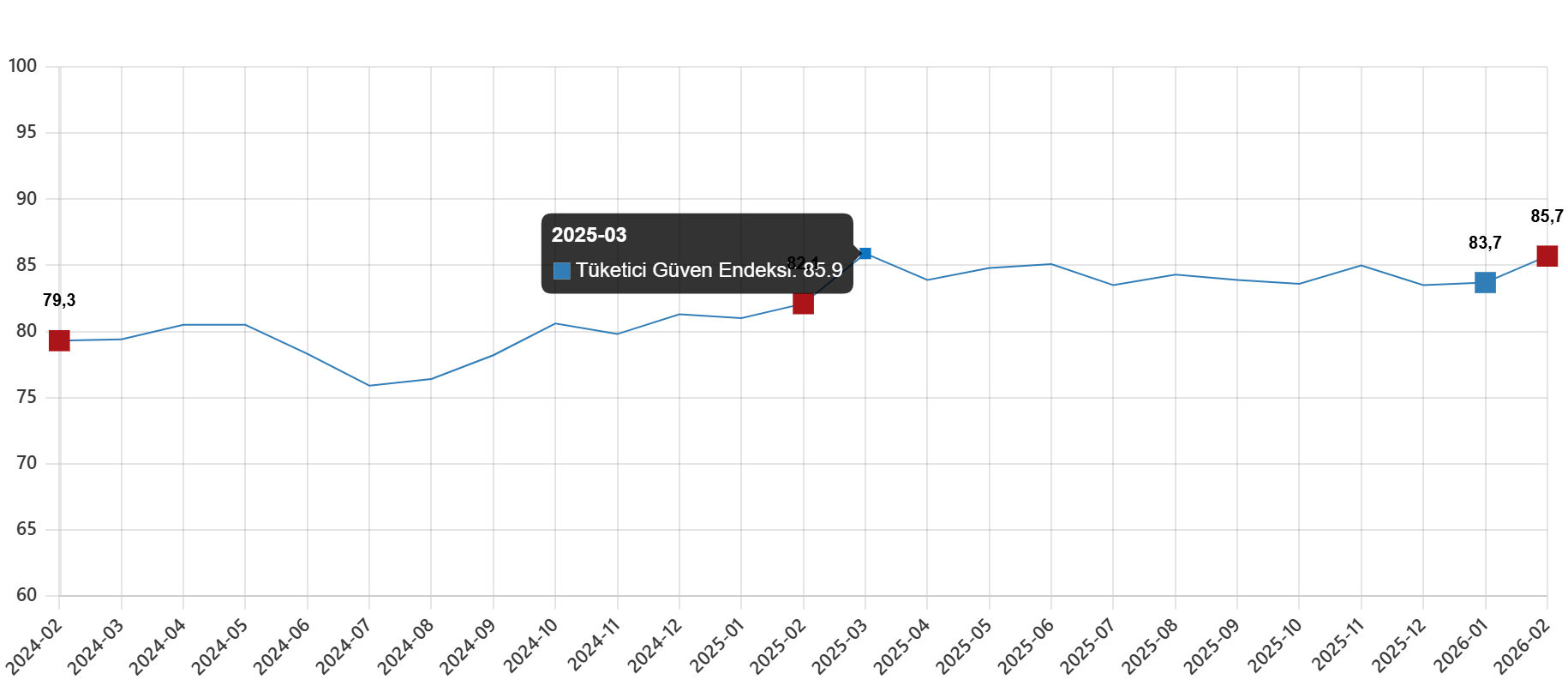 Türkiye İstatistik Kurumu ve Türkiye Cumhuriyet Merkez Bankası işbirliği ile yürütülen tüketici eğilim anketi sonuçlarından hesaplanan tüketici güven endeksi, Ocak ayında 83,7 iken Şubat ayında %2,3 oranında artarak 85,7 oldu.