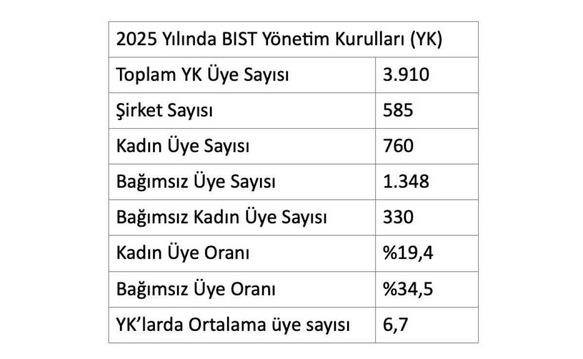 Bu üyelerin 1.348’ini (yüzde 34,5) bağımsız yönetim kurulu üyeleri oluşturdu. Kadın üye oranı ise yeni atamalarla birlikte yüzde 18,7’den yüzde 19,4’e yükseldi. Artış sınırlı kalsa da kadın temsilinde yukarı yönlü eğilim devam etti.