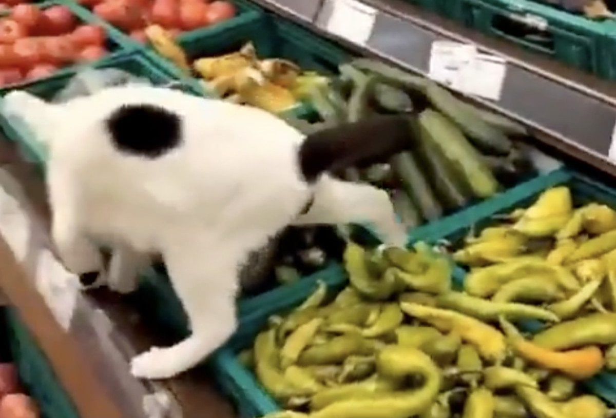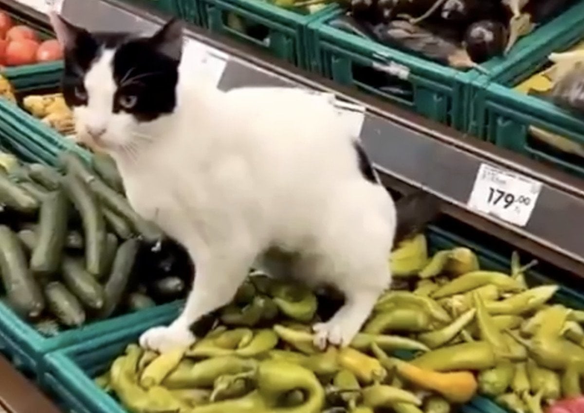 Marketin sebze reyonunda dolaşan bir kadın, raflardaki biberlerin üzerinde duran bir kediyi fark etti.