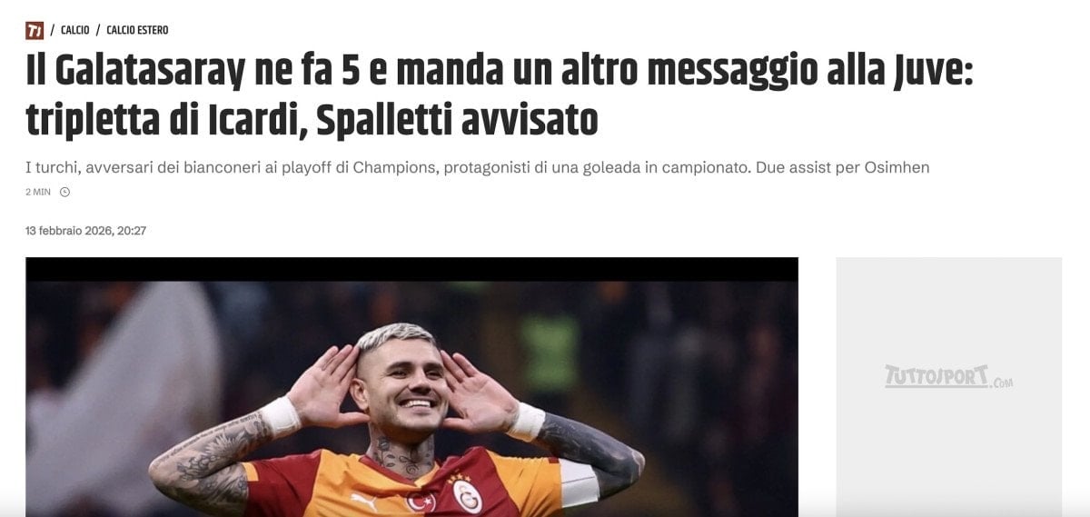 “Galatasaray, Juventus’a güçlü bir mesaj gönderdi. Türk ekibi, ligde Eyüpspor’u 5-1’lik skorla mağlup ederek, 17 Şubat’ta Juventus’a karşı oynanacak Şampiyonlar Ligi play-off maçı öncesinde en iyi formunda olduğunu gösterdi. Gecenin yıldızı, ilk ve ikinci yarıda attığı gollerle hat-trick yapan Mauro Icardi oldu”