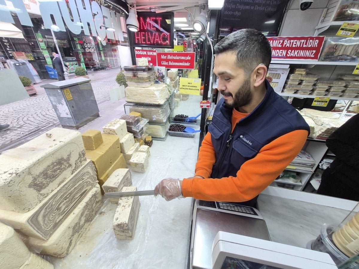 Ben burada tahini kendim çekiyorum. Met helvasının kilosunu 420 TL yaptık, sade helvalarımız 320 TL, pekmezlerimiz ise 250 lira. Bu ürünleri Ramazan Ayı’nda biz kendimiz de tüketiyoruz. Helvalarımız ve tahinlerimiz sahurda tüketilince tok tutuyor.”