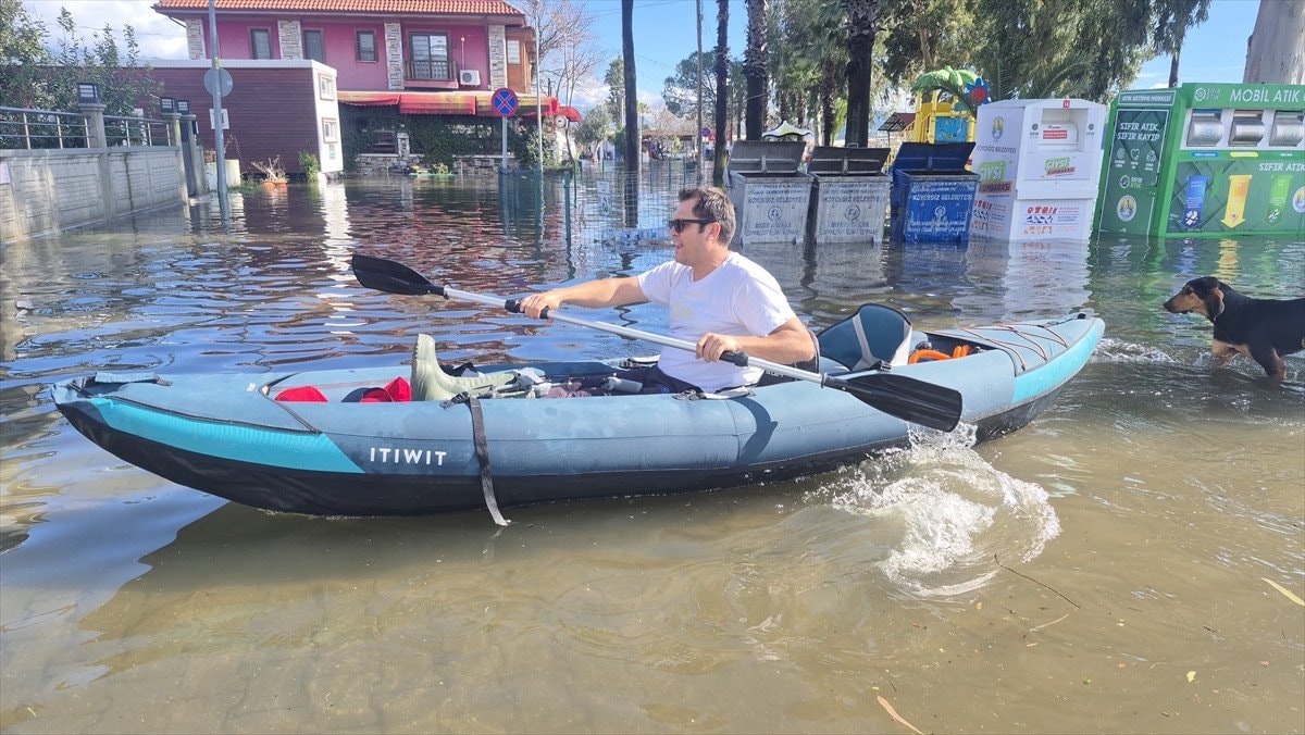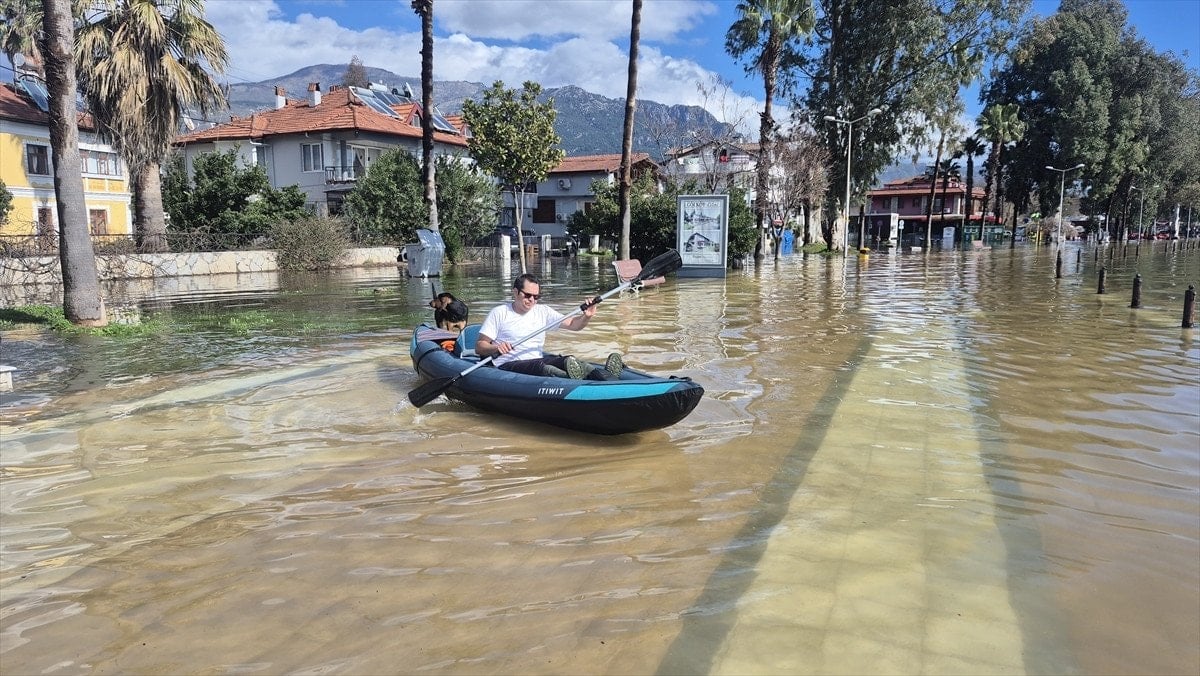 Muğla’da vatandaşlar Köyceğiz Gölü’nün taşması ile sokaklarda kano ile gezdi