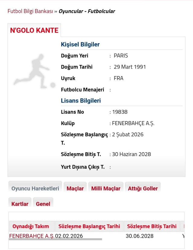 Devre arası transfer döneminde orta sahasını güçlendirmek isteyen Fenerbahçe, uzun süredir gündeminde yer alan dünyaca ünlü yıldız N’Golo Kanté’yi kadrosuna kattı. Sarı-lacivertliler, Fransız futbolcuyla 2028 yılına kadar sözleşme imzalandığını Türkiye Futbol Federasyonu’na bildirdi.