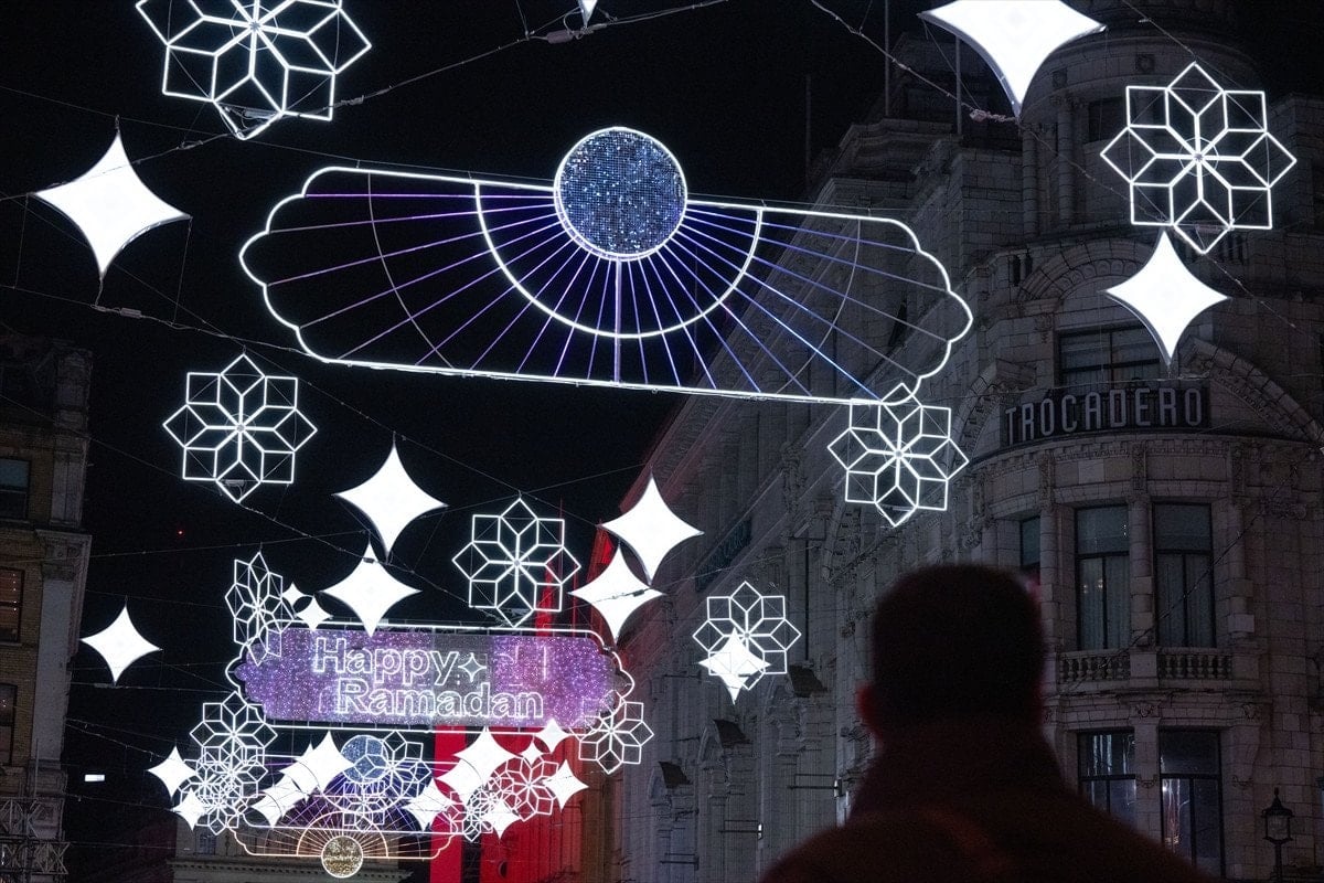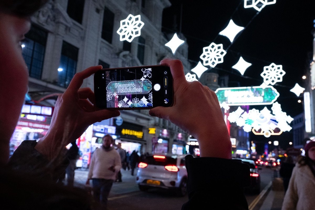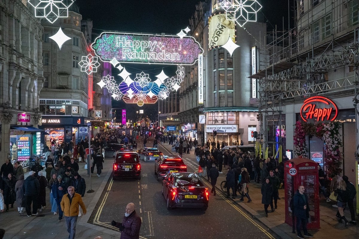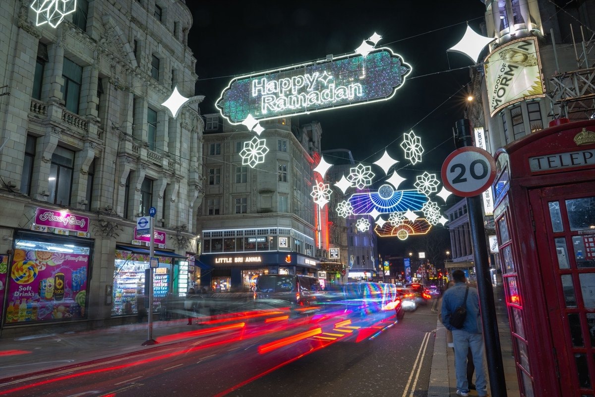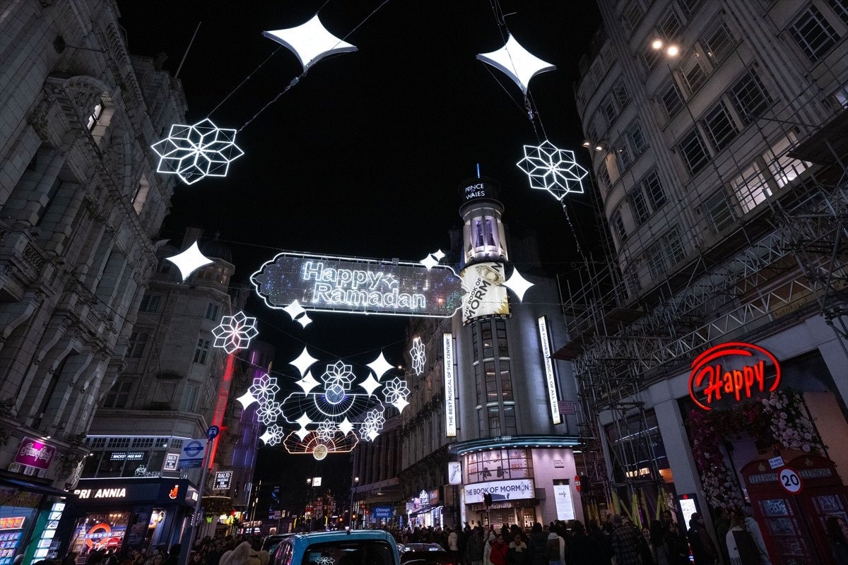 Piccadilly Circus’tan Leicester Square’e uzanan cadde, 30 binden fazla LED ışıkla donatıldı ve “Happy Ramadan” (Mutlu Ramazanlar) yazılarıyla ziyaretçileri karşılıyor.