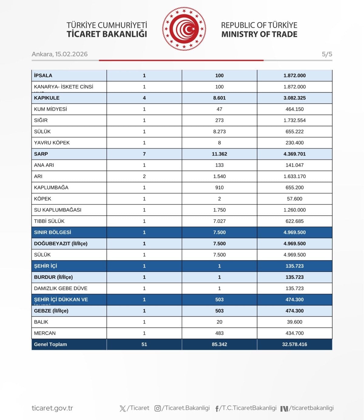 Bu kapsamda, 2025 yılı içerisinde gerçekleştirilen operasyonlarda toplam 51 ayrı olayda 85 bin 342 adet canlı hayvan ele geçirilmiş olup, söz konusu kaçak girişimlerin toplam maddi değeri 32 milyon 578 bin 416 TL olarak hesaplanmıştır.