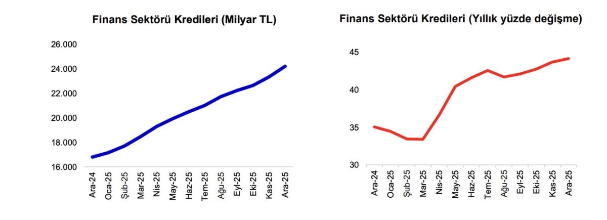 Türkiye Bankalar Birliği (TBB) Risk Merkezi üyesi kuruluşlar tarafından kullandırılan nakdi krediler, 2025 Aralık itibarıyla, geçen yılın aynı ayına göre yüzde 44 artarak 24 bin 204 milyar TL oldu.