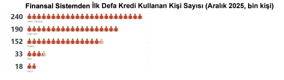 Aralık ayında 240 bin kişi ilk defa kredili mevduat hesabı, 190 bin kişi ilk defa kredi kartı, 152 bin kişi ilk defa tüketici kredisi kullanırken, ilk defa taşıt kredisi kullanan kişi sayısı 33 bin oldu. 18 bin kişi ise ilk defa konut kredisi kullandı.