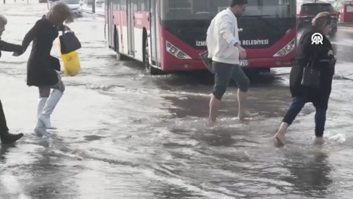 İzmir’de yağmur yine hayatı felç etti: Caddeler nehre dönüştü