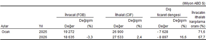 Türkiye İstatistik Kurumu ile Ticaret Bakanlığı iş birliğiyle genel ticaret sistemi kapsamında üretilen geçici dış ticaret verilerine göre; ihracat 2026 yılı Ocak ayında, bir önceki yılın aynı ayına göre %4,0 azalarak 20 milyar 315 milyon dolar, ithalat %0,1 artarak 28 milyar 695 milyon dolar olarak gerçekleşti.
