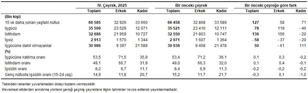 İş gücü, 2025 yılı dördüncü çeyreğinde bir önceki çeyreğe göre 78 bin kişi artarak 35 milyon 599 bin kişi, işgücüne katılma oranı ise 0,1 puanlık artış ile yüzde 53,5 olarak gerçekleşti.
