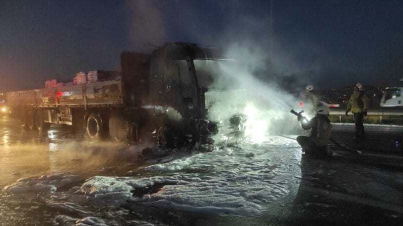 Bu sabah saat 07.00 sıralarında, İstanbul’un Eyüpsultan ilçesi Okmeydanı–Hasdal Bağlantı Yolu üzerinde, Serdar Demir’in kullandığı tırın sağ kısmından seyir halindeyken dumanlar yükselmeye başladı.
