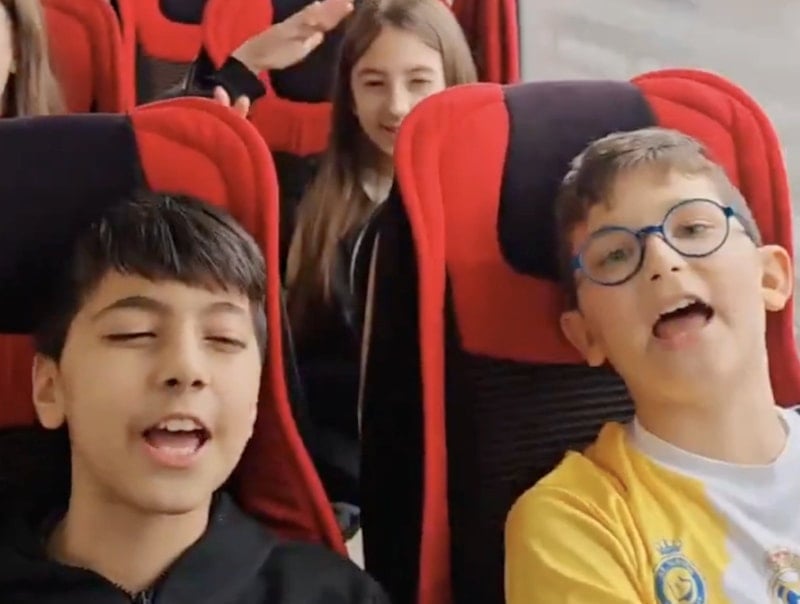 Görüntülerde otobüste oturan çocukların coşkuyla hep bir ağızdan ilahi söyledikleri anlar yer aldı.